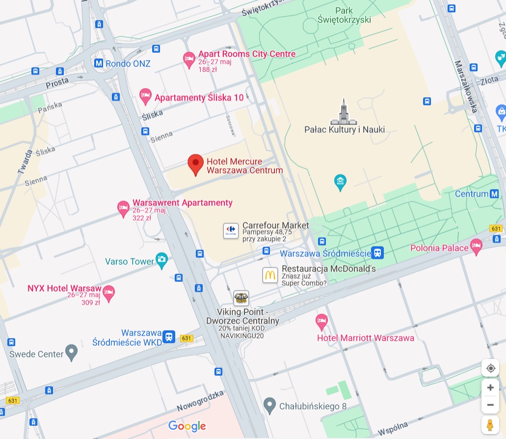 Dworzec kolejowy Warszawa Centralna oddalony jest od obiektu zaledwie o 300 metrów. Odległość od stacji metra Centrum to 800 metrów.